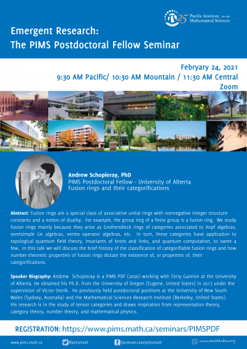 Andrew Schopieray is a PIMS PDF (2020) working with Terry Gannon at the University of Alberta. He obtained his Ph.D. from the University of Oregon (Eugene, United States) in 2017 under the supervision of Victor Ostrik. He previously held postdoctoral positions at the University of New South Wales (Sydney, Australia) and the Mathematical Sciences Research Institute (Berkeley, United States). His research is in the study of tensor categories and draws inspiration from representation theory, category theory, number theory, and mathematical physics.