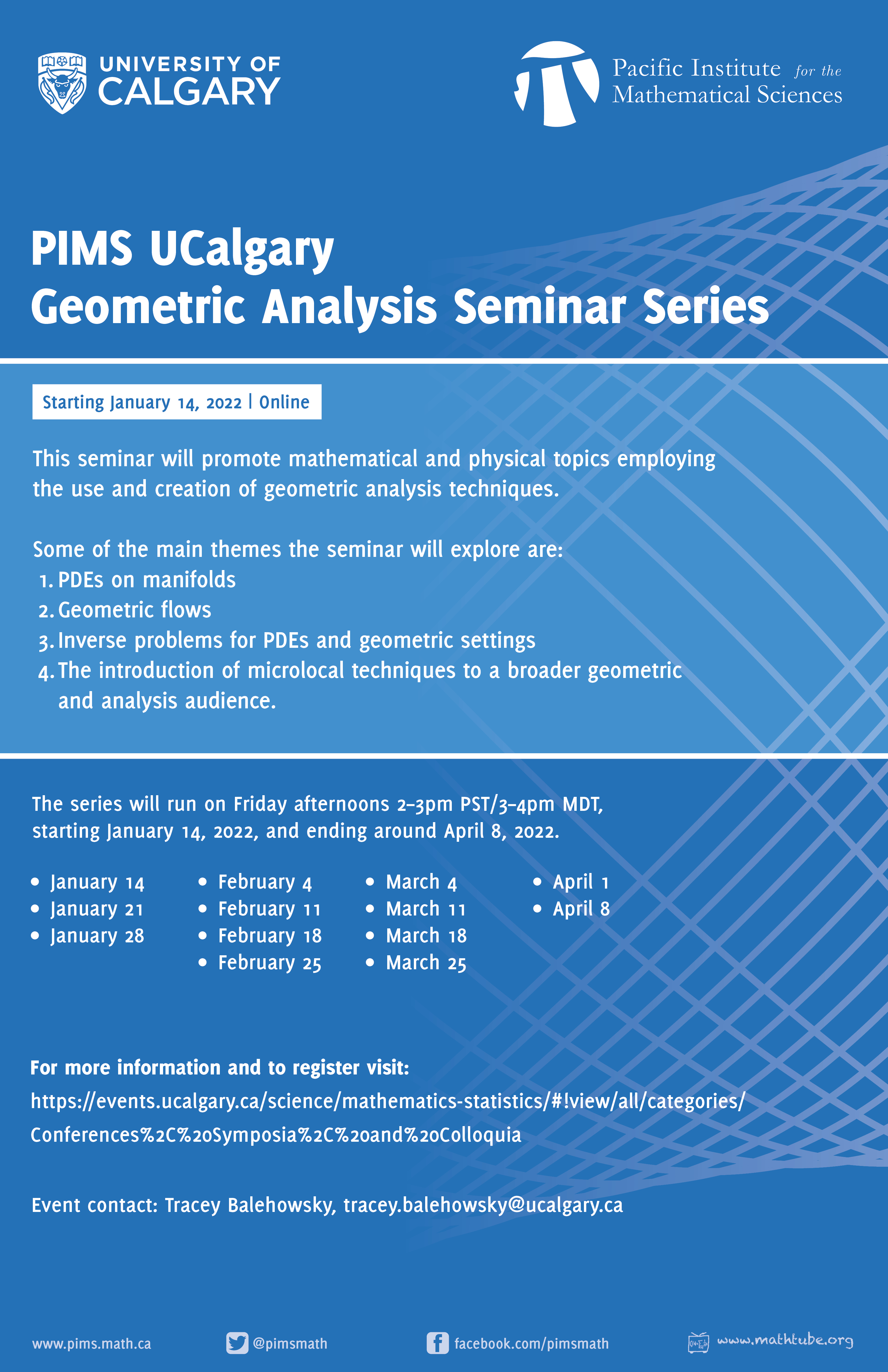 This seminar series will promote mathematical and physical topics employing the use and creation of geometric analysis techniques. Some of the main themes the seminar will explore are 1) PDEs on manifolds, 2) geometric flows, 3) inverse problems for PDEs and geometric settings, and 4) the introduction of microlocal techniques to a broader geometric and analysis audience.