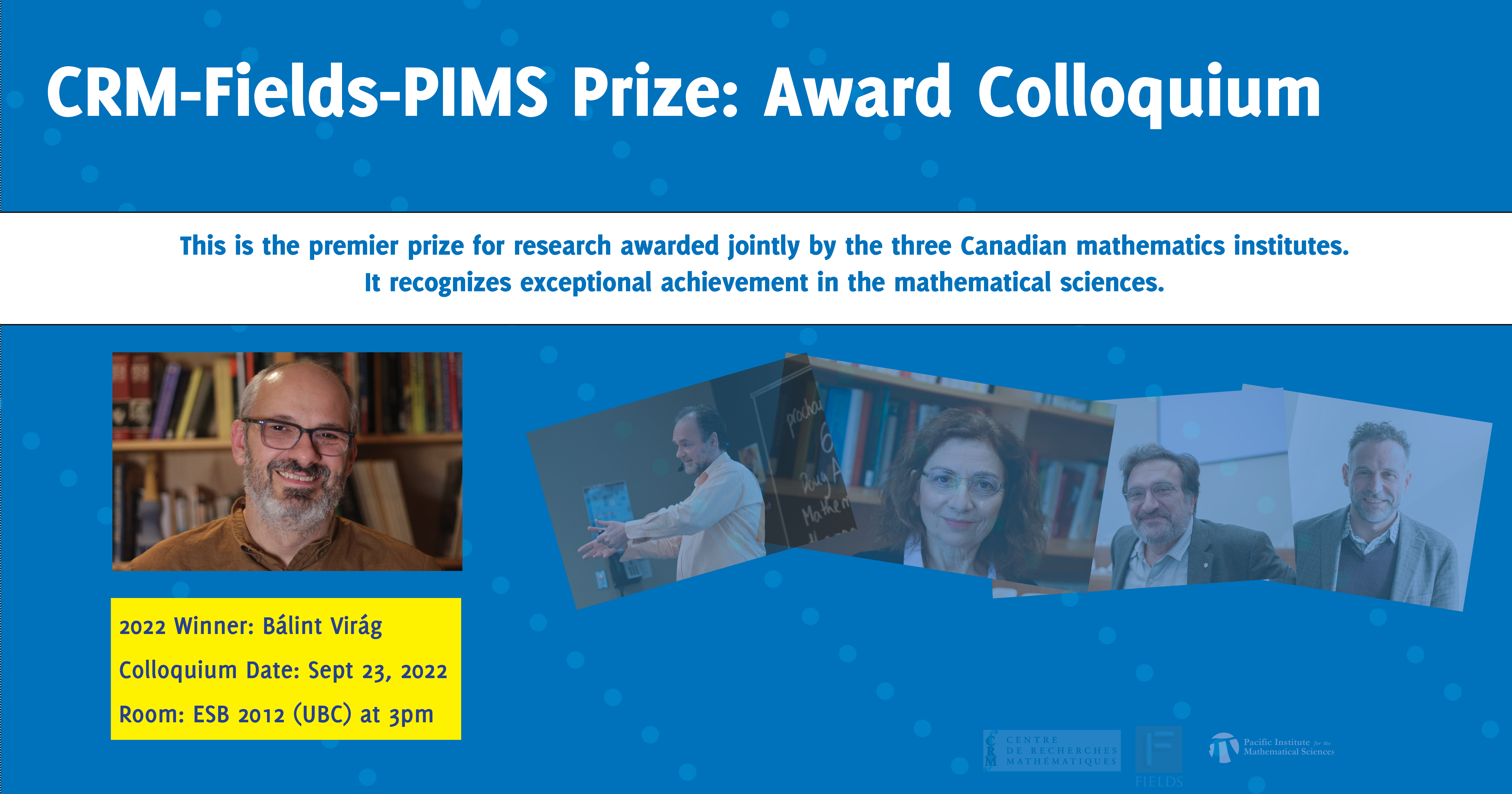 The CRM-Fields-PIMS prize is the premier Canadian award for research achievements in the mathematical sciences. It is awarded jointly by the three largest Canadian mathematics institutes: the Centre de Recherches Mathématiques (CRM), the Fields Institute, and the Pacific Institute for the Mathematical Sciences (PIMS). The winner's research should have been conducted primarily in Canada or in affiliation with a Canadian university. The main selection criterion is outstanding contribution to the advancement of research. As part of this recognition, Professor Virág will receive a monetary award and an invitation to present a lecture at each institute.