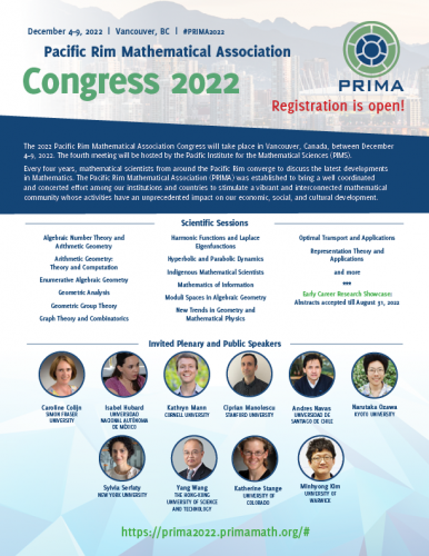 The 2022 Pacific Rim Mathematical Association Congress will be take place in Vancouver, Canada, between December 4-9, 2022. The fourth meeting will be hosted by the Pacific Institute for the Mathematical Sciences (PIMS).