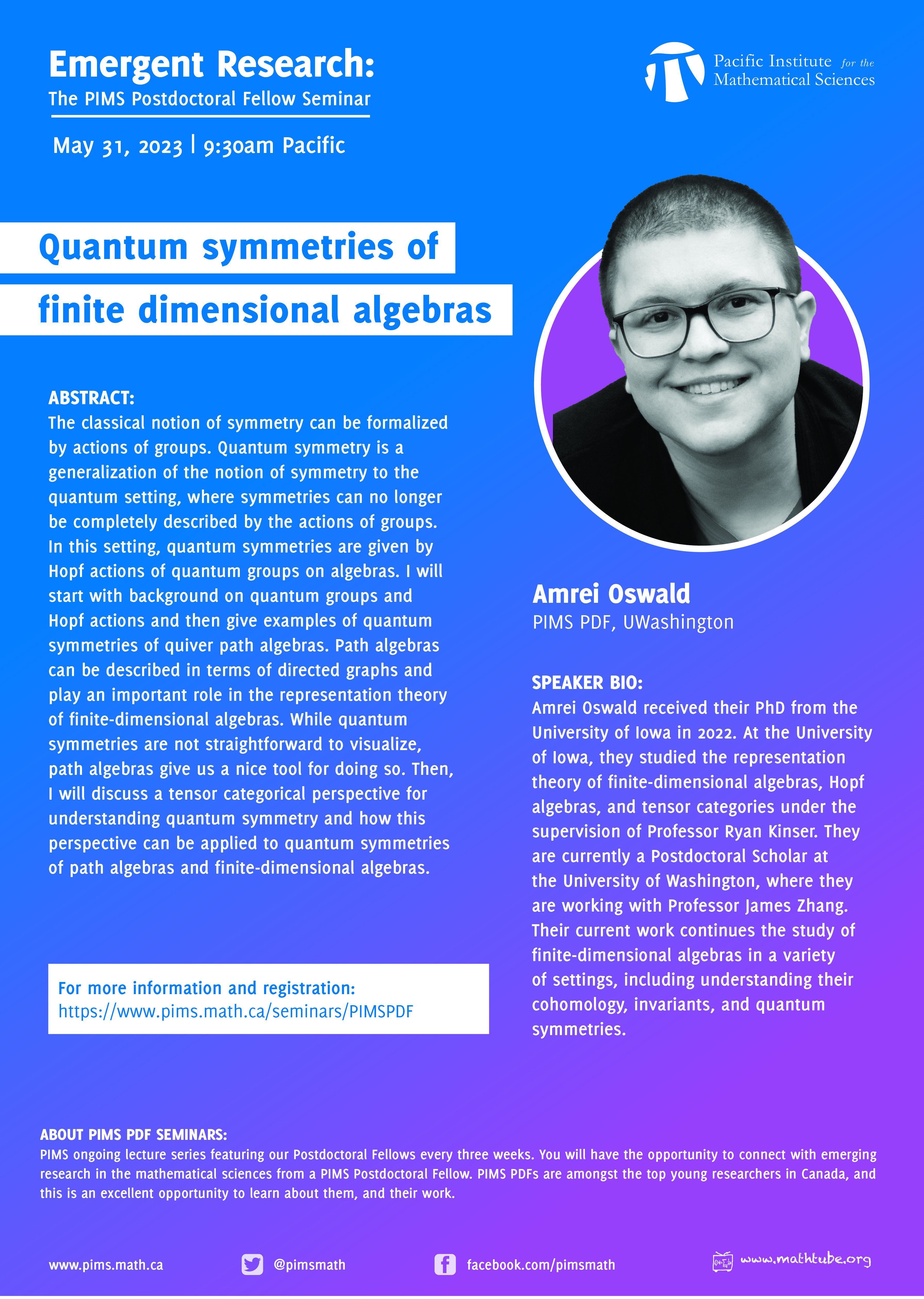Speaker biography: Amrei Oswald received their PhD from the University of Iowa in 2022. At the University of Iowa, they studied the representation theory of finite-dimensional algebras, Hopf algebras, and tensor categories under the supervision of Professor Ryan Kinser. They are currently a Postdoctoral Scholar at the University of Washington, where they are working with Professor James Zhang. Their current work continues the study of finite-dimensional algebras in a variety of settings, including understanding their cohomology, invariants, and quantum symmetries.